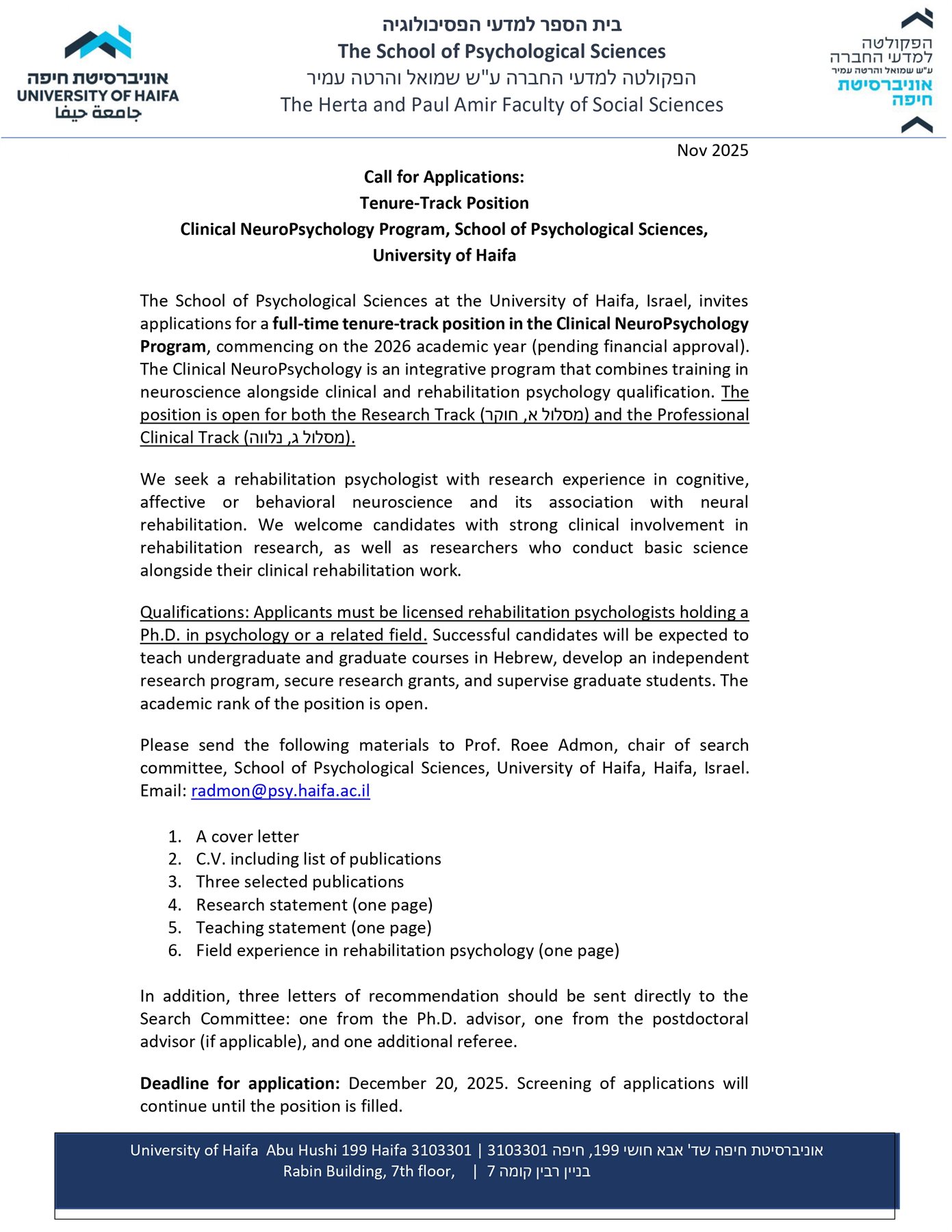 אנו שמחים לבשר שנפתח קול קורא בתוכנית לנוירופסיכולוגיה קלינית באוניברסיטת חיפה לגיוס של חבר סגל נוסף, פסיכולוג שיקומי, במסלול א (חוקר) או מסלול ג (נלווה).
