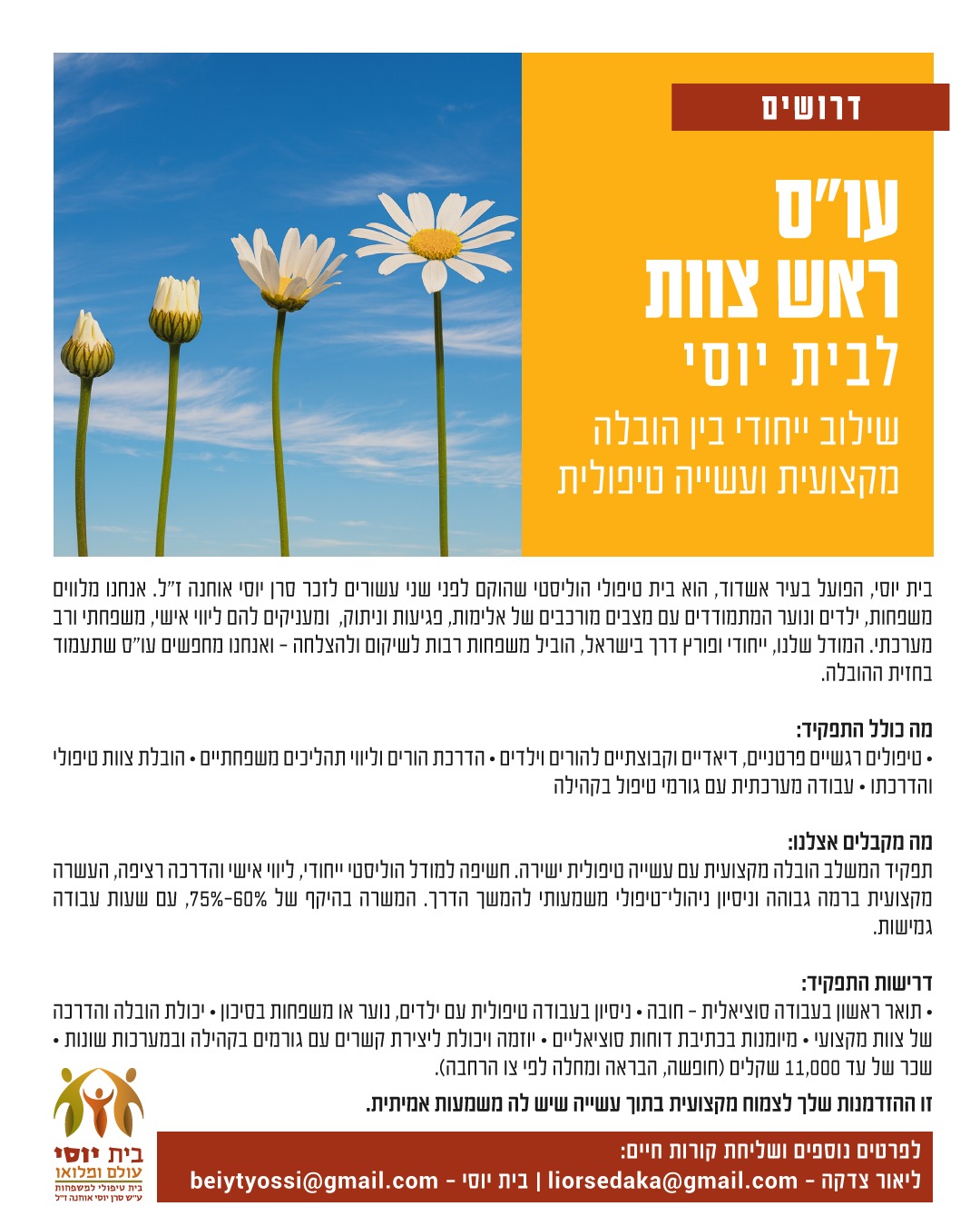 דרוש.ה עו"ס ראש צוות ל"בית יוסי" בית טיפולי למשפחות בסיכון באשדוד