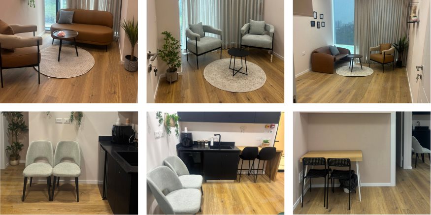 חלל חמים ומעוצב, עם חדרי טיפול פרטיים, שולחנות עבודה, אזורי כתיבה וישיבה נוחים, וחדר המתנה עם פינת קפה.