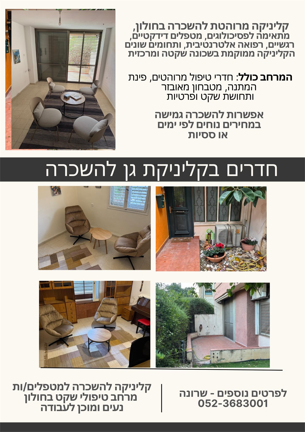 קליניקה טיפולית במרחב שקט ונעים להשכרה בחולון