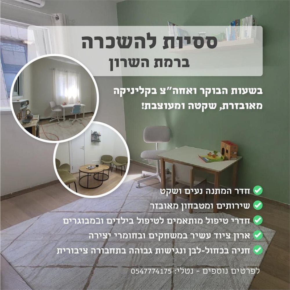 התפנו ססיות בשעות הבוקר ואחה"צ בקליניקה מושקעת ברמת השרון שמתאימה לטיפולי קלינאות תקשורת, ריפוי בעיסוק, טיפול באומנות, טיפוליים רגשיים ועוד.
