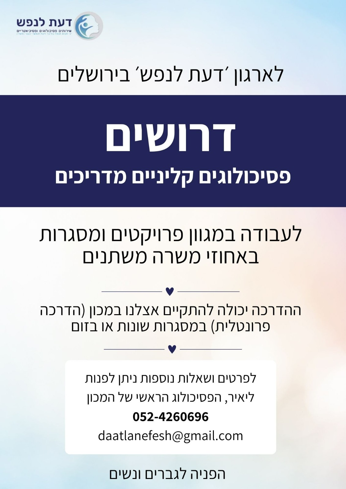 לארגון דעת לנפש דרושים פסיכולוגים קליניים מדריכים בירושלים