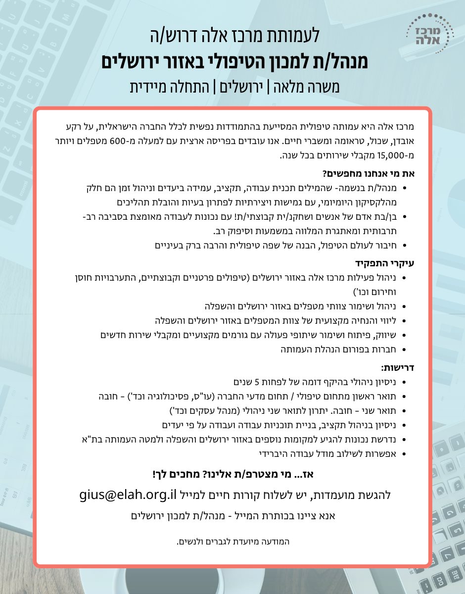 לעמותת מרכז אלה דרוש/ה מנהל/ת למכון הטיפולי באזור ירושלים