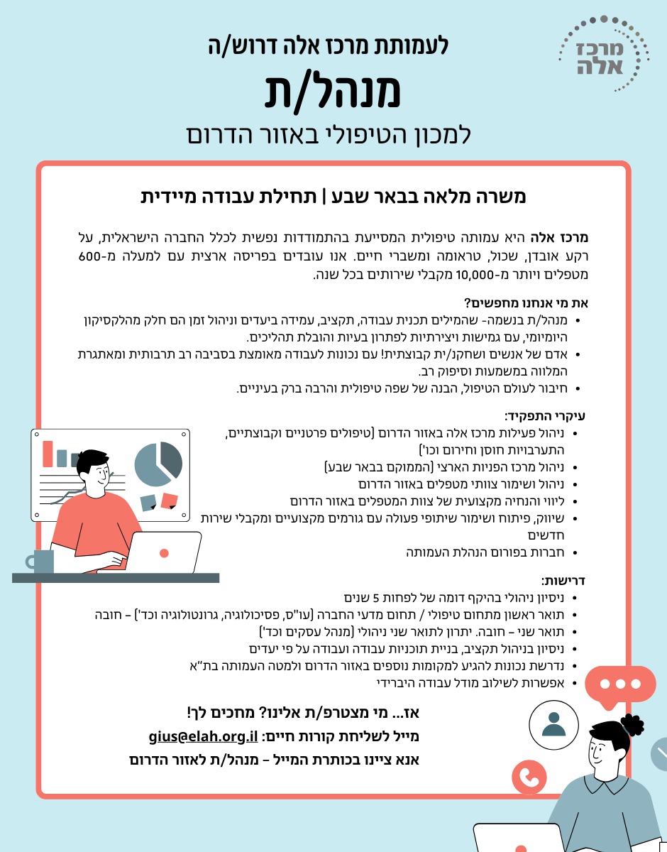 לעמותת מרכז אלה דרוש/ה מנהל/ת למכון הטיפולי באזור הדרום