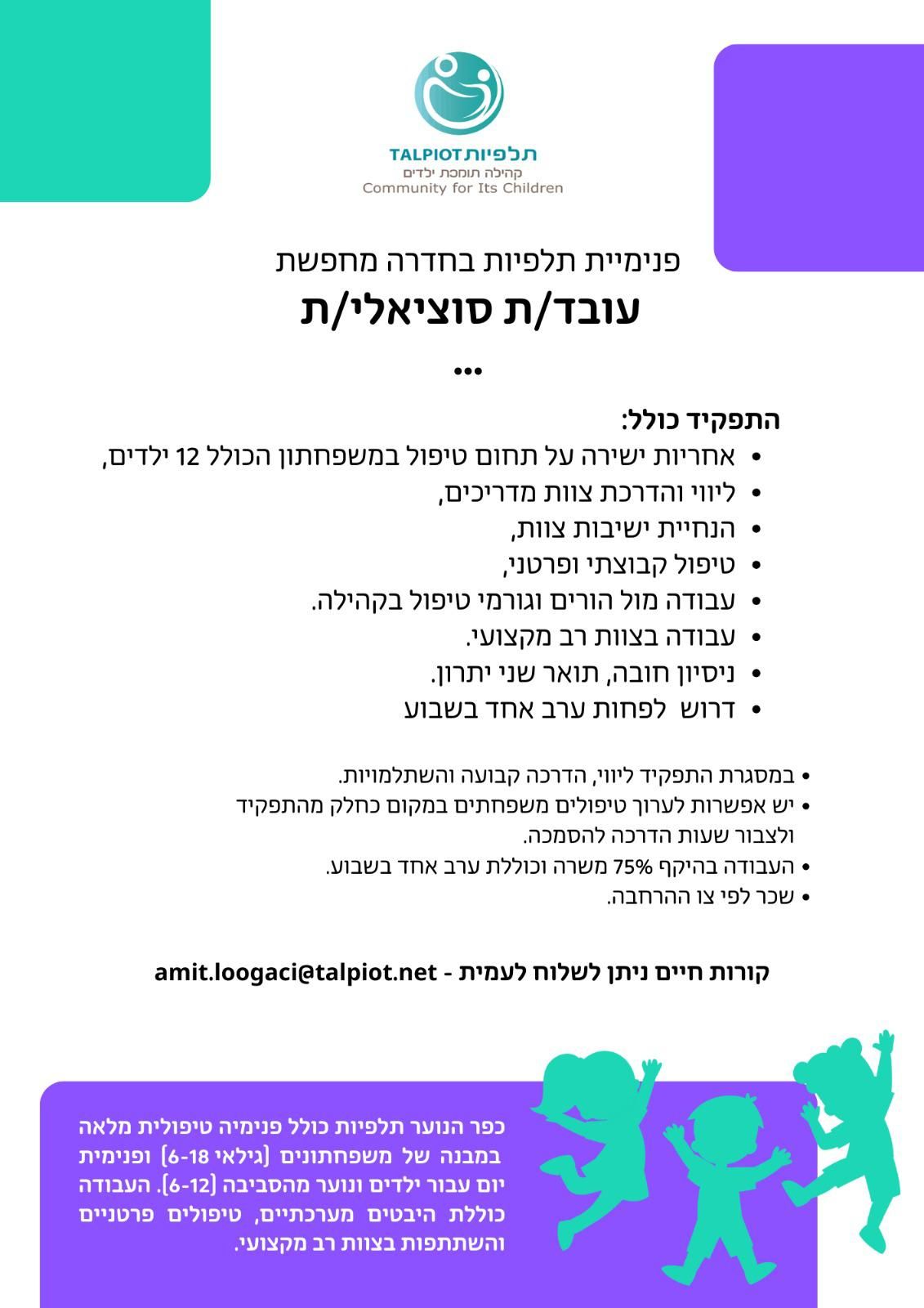 דרוש/ה עובד/ת סוציאלי/ת לפנימית תלפיות בחדרה
