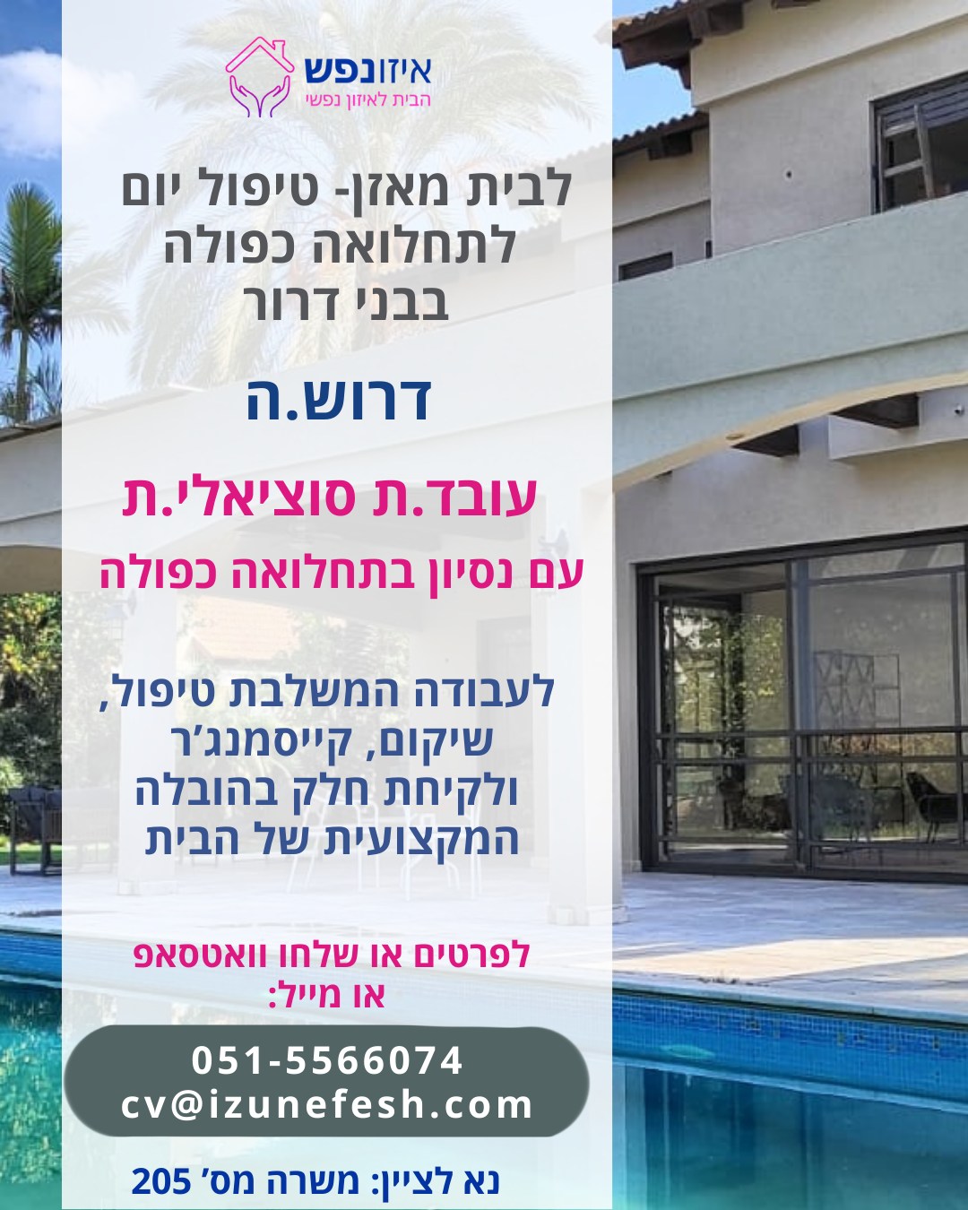 למסגרת מקצועית חמה ומתפתחת דרוש/ה עובד/ת סוציאלי/ת לעבודה משמעותית בתחום הטיפול בהתמכרויות בקרב מבוגרים. פורסם ב-05/03/26