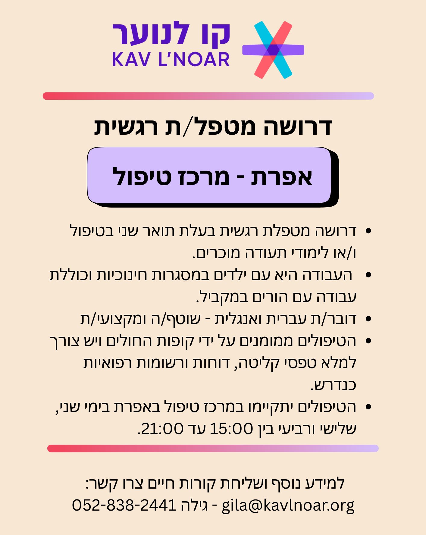 דרוש/ה מטפל/ת רגשי/ת דובר/ת עברית ואנגלית למרכז טיפול באפרת