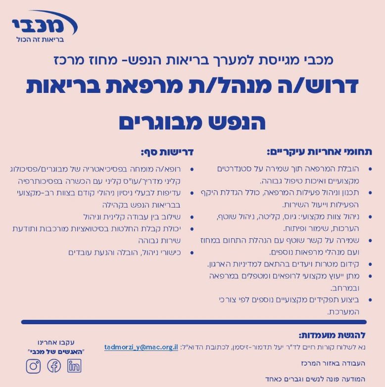 דרוש.ה רופא.ה מומחה בפסיכיאטריה / פסיכולוג.ית קליני.ת מדריכ.ה / עו"ס.ית קליני.ת עם הכשרה בפסיכותרפיה להובלת וניהול המרפאה. פורסם ב- 19/10/25