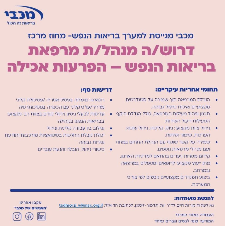 למכבי שירותי בריאות מנהל/ת מרפאת ברה"ן הפרעות-אכילה למחוז מרכז