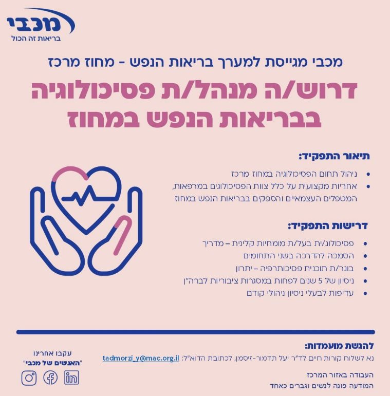 מכבי שירותי בריאות מגייסת מנהל/ת פסיכולוגיה למחוז ירושלים-שפלה