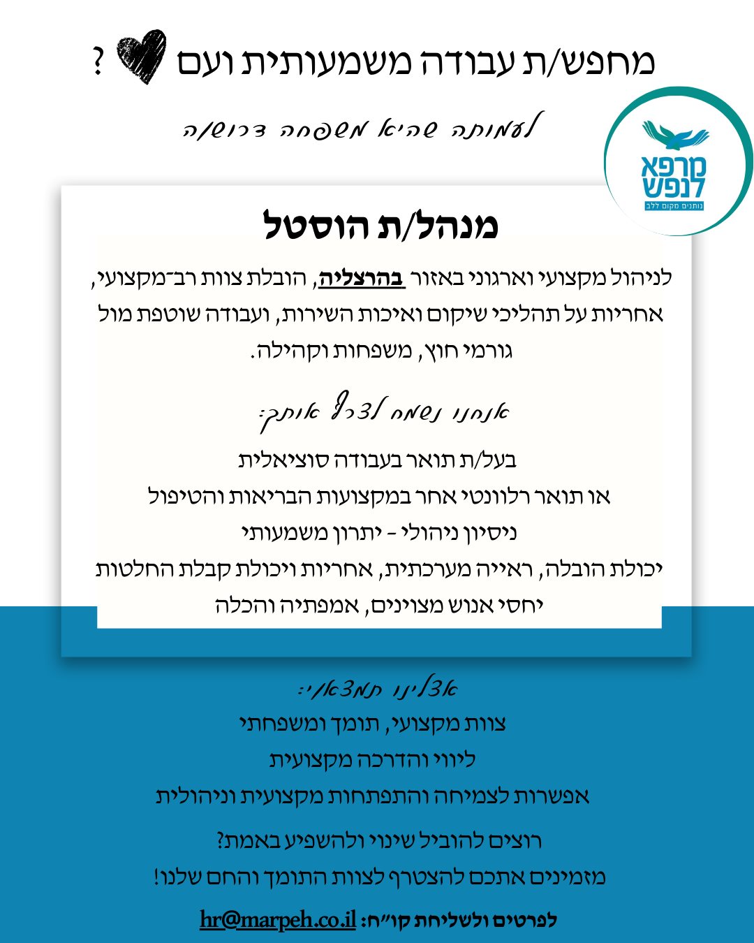 לעמותת מרפא לנפש דרוש/ה מנהל/ת הוסטל בהרצליה