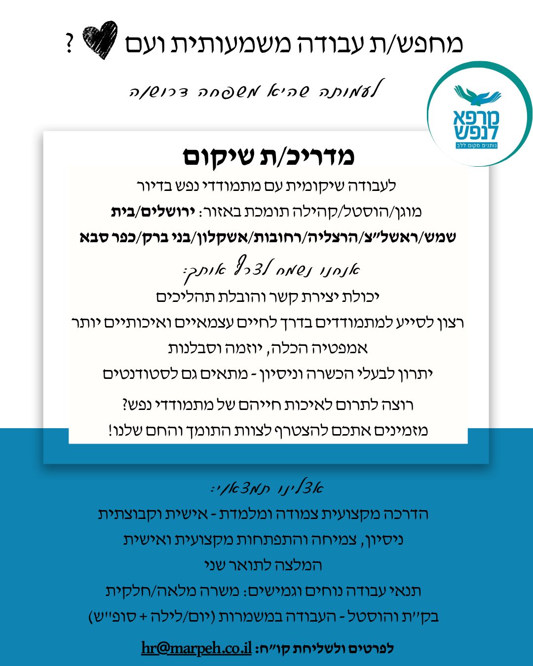לעמותת מרפא לנפש דרושים מדריכי שיקום ברחבי הארץ