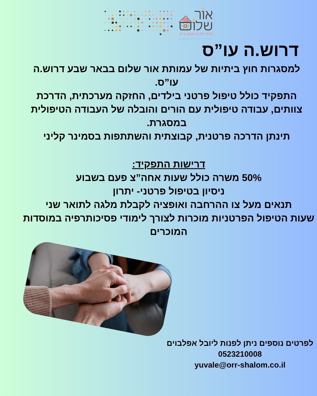 לעמותת אור שלום דרוש/ה עו"ס/ית למסגרות חוץ ביתיות בבאר שבע