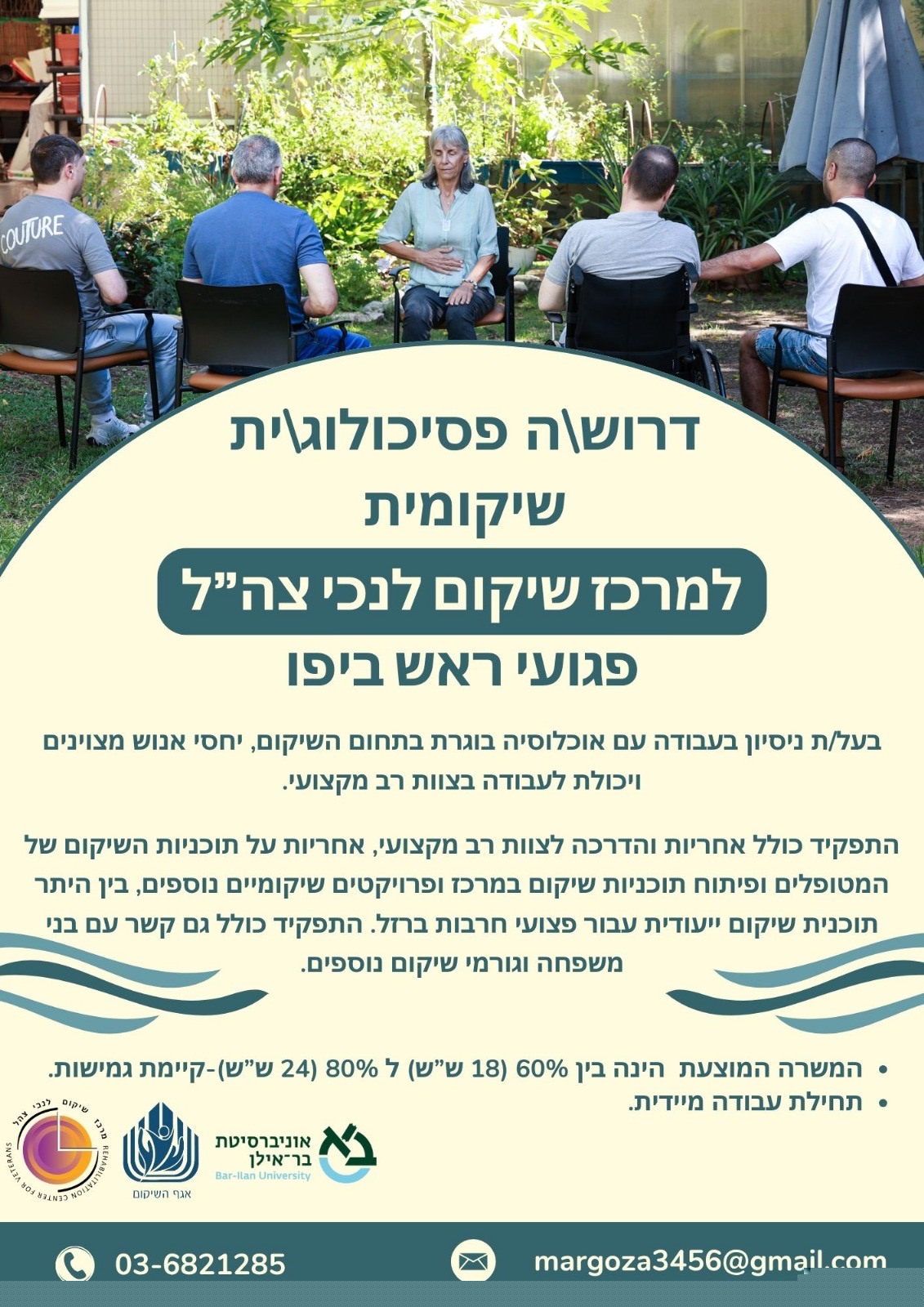 דרוש/ה פסיכולוג/ית שיקומי/ת למרכז שיקום לנכי צה״ל נפגעי ראש ביפו