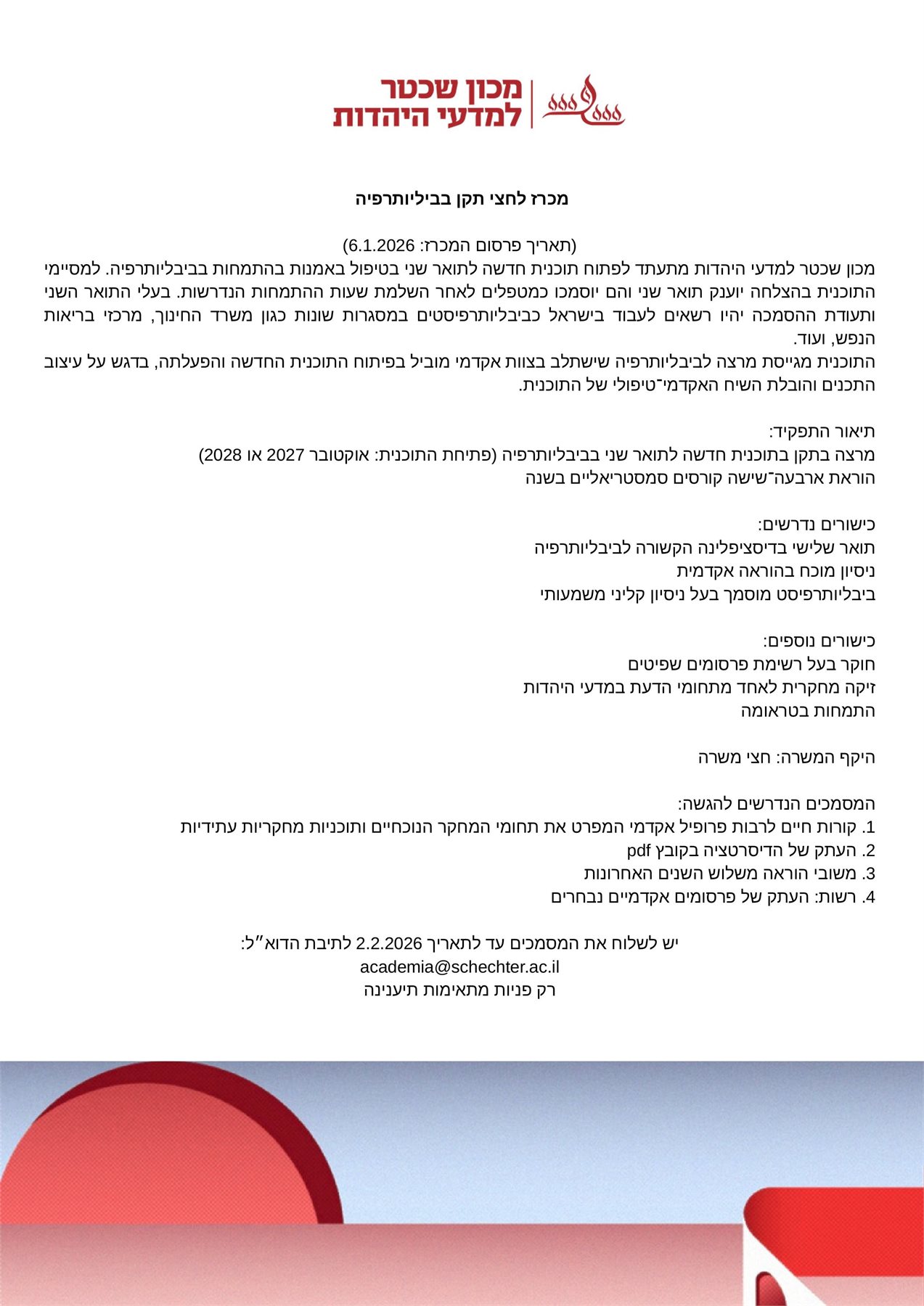 מכון שכטר למדעי היהדות - נפתח מכרז לחצי תקן מרצה בביבליותרפיה