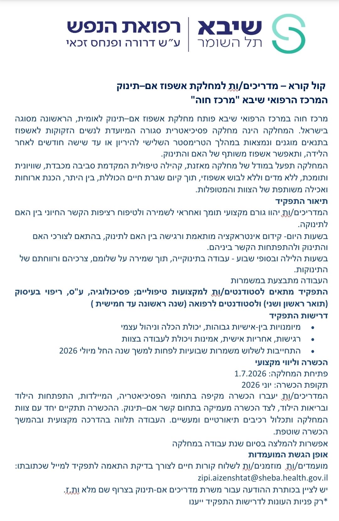 קול קורא של המרכז הרפואי שיבא - מדריכים/ות למחלקת אשפוז אם-תינוק