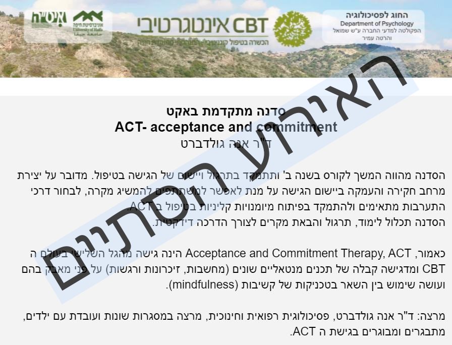 סדרת מפגשים מקוונים המציעה גישות, מודלים והתערבויות שהתגבשו בשדה הטיפולי במענה למגוון קשיים ומצוקות נפשיות, ומטרתה להנגיש לקהילה המקצועית ידע מקצועי שהתפתח סביב אתגרים טיפוליים ספציפיים.