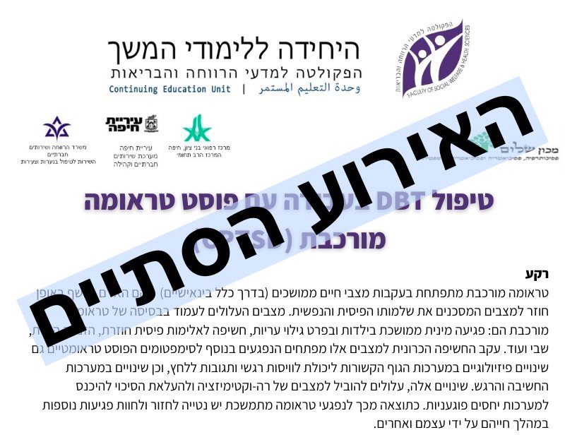 המציאות בישראל בשנים האחרונות מעצימה עוד יותר את הצורך במטפלים מיומנים, בעלי כלים מעשיים ותשתית תיאורטית יציבה. הקורס "מפת הדרכים לטיפול בטראומה" מבוסס על ניסיון קליני, מחקרי והדרכתי רחב היקף.