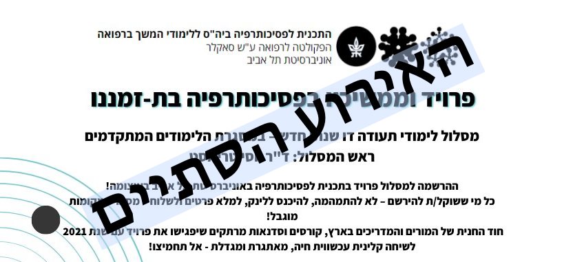 סדרת מפגשים מקוונים המציעה גישות, מודלים והתערבויות שהתגבשו בשדה הטיפולי במענה למגוון קשיים ומצוקות נפשיות, ומטרתה להנגיש לקהילה המקצועית ידע מקצועי שהתפתח סביב אתגרים טיפוליים ספציפיים.