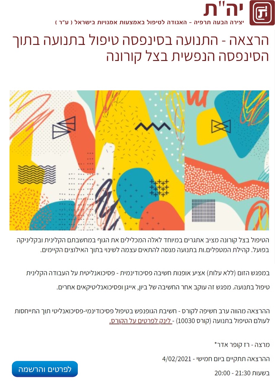 סדרת מפגשים מקוונים המציעה גישות, מודלים והתערבויות שהתגבשו בשדה הטיפולי במענה למגוון קשיים ומצוקות נפשיות, ומטרתה להנגיש לקהילה המקצועית ידע מקצועי שהתפתח סביב אתגרים טיפוליים ספציפיים.