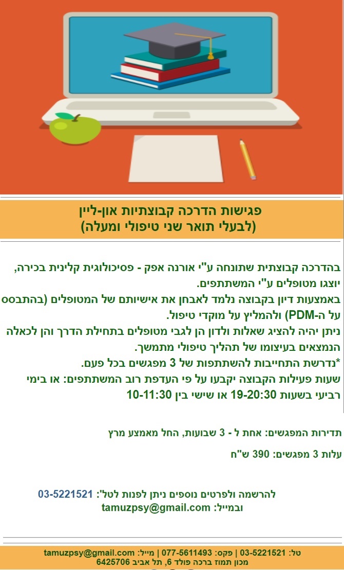 סדרת מפגשים מקוונים המציעה גישות, מודלים והתערבויות שהתגבשו בשדה הטיפולי במענה למגוון קשיים ומצוקות נפשיות, ומטרתה להנגיש לקהילה המקצועית ידע מקצועי שהתפתח סביב אתגרים טיפוליים ספציפיים.