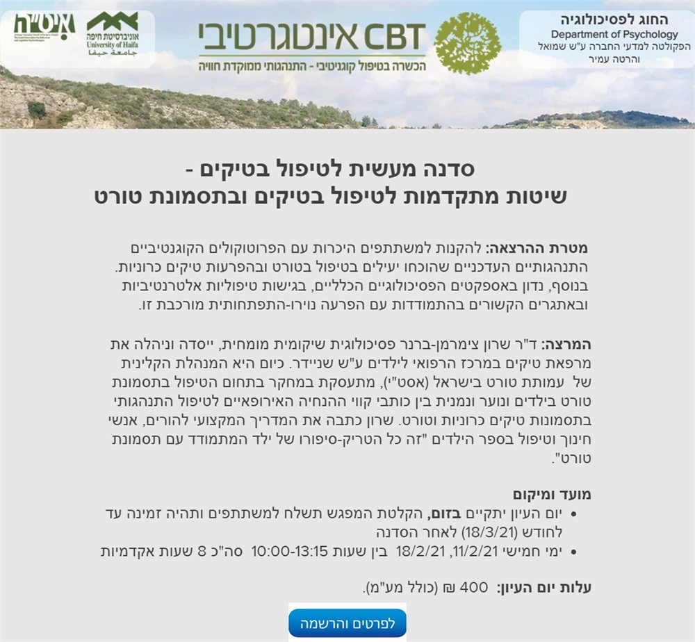 סדרת מפגשים מקוונים המציעה גישות, מודלים והתערבויות שהתגבשו בשדה הטיפולי במענה למגוון קשיים ומצוקות נפשיות, ומטרתה להנגיש לקהילה המקצועית ידע מקצועי שהתפתח סביב אתגרים טיפוליים ספציפיים.
