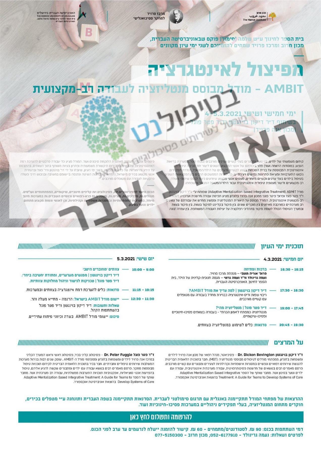 סדרת מפגשים מקוונים המציעה גישות, מודלים והתערבויות שהתגבשו בשדה הטיפולי במענה למגוון קשיים ומצוקות נפשיות, ומטרתה להנגיש לקהילה המקצועית ידע מקצועי שהתפתח סביב אתגרים טיפוליים ספציפיים.