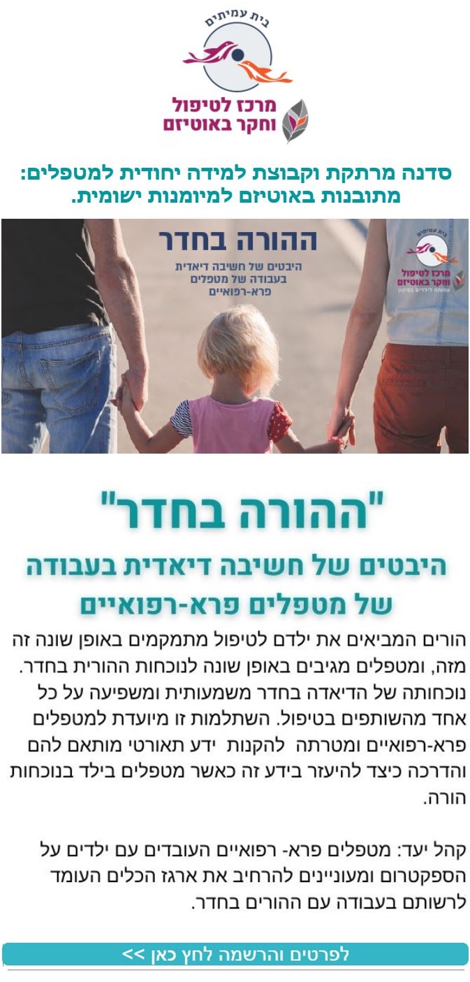 סדרת מפגשים מקוונים המציעה גישות, מודלים והתערבויות שהתגבשו בשדה הטיפולי במענה למגוון קשיים ומצוקות נפשיות, ומטרתה להנגיש לקהילה המקצועית ידע מקצועי שהתפתח סביב אתגרים טיפוליים ספציפיים.