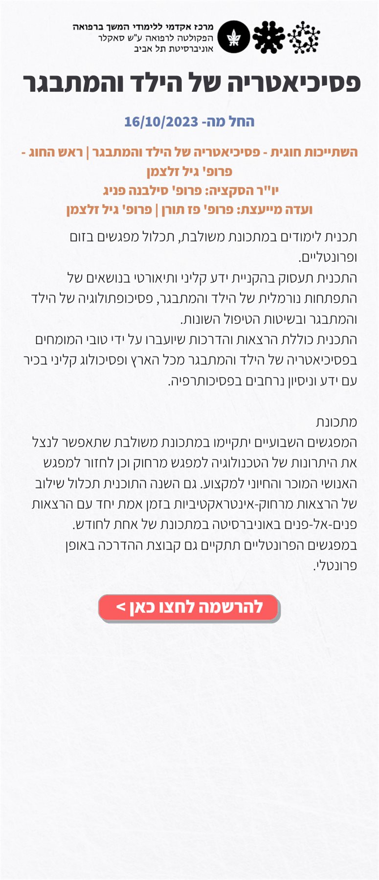 סדרת מפגשים מקוונים המציעה גישות, מודלים והתערבויות שהתגבשו בשדה הטיפולי במענה למגוון קשיים ומצוקות נפשיות, ומטרתה להנגיש לקהילה המקצועית ידע מקצועי שהתפתח סביב אתגרים טיפוליים ספציפיים.