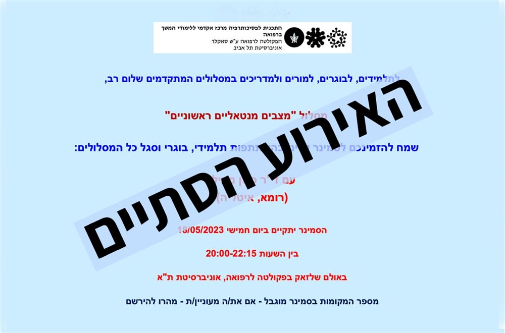 סדרת מפגשים מקוונים המציעה גישות, מודלים והתערבויות שהתגבשו בשדה הטיפולי במענה למגוון קשיים ומצוקות נפשיות, ומטרתה להנגיש לקהילה המקצועית ידע מקצועי שהתפתח סביב אתגרים טיפוליים ספציפיים.