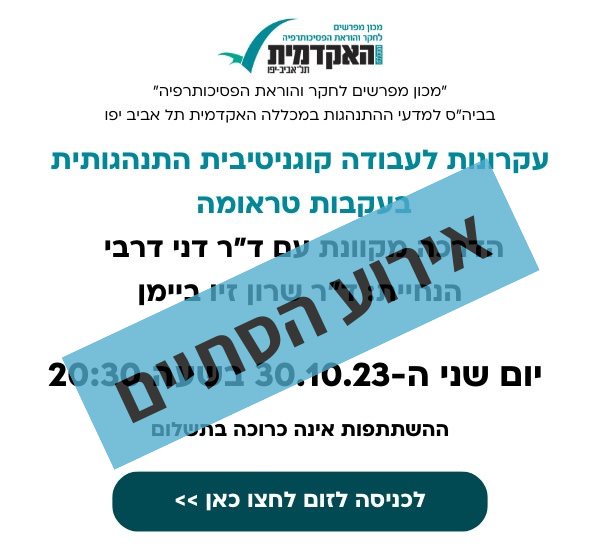 המציאות בישראל בשנים האחרונות מעצימה עוד יותר את הצורך במטפלים מיומנים, בעלי כלים מעשיים ותשתית תיאורטית יציבה. הקורס "מפת הדרכים לטיפול בטראומה" מבוסס על ניסיון קליני, מחקרי והדרכתי רחב היקף.