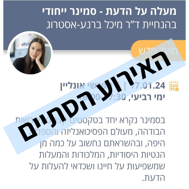 סדרת מפגשים מקוונים המציעה גישות, מודלים והתערבויות שהתגבשו בשדה הטיפולי במענה למגוון קשיים ומצוקות נפשיות, ומטרתה להנגיש לקהילה המקצועית ידע מקצועי שהתפתח סביב אתגרים טיפוליים ספציפיים.