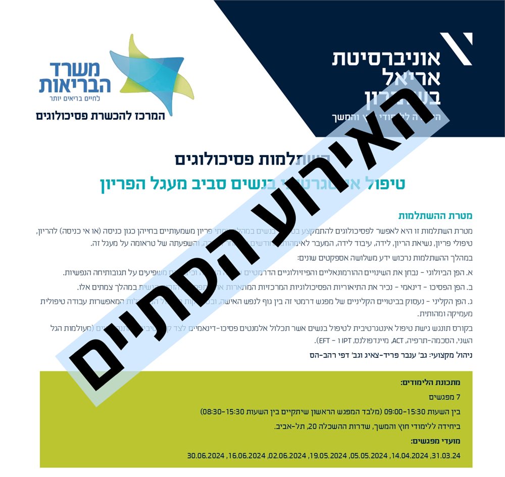 סדרת מפגשים מקוונים המציעה גישות, מודלים והתערבויות שהתגבשו בשדה הטיפולי במענה למגוון קשיים ומצוקות נפשיות, ומטרתה להנגיש לקהילה המקצועית ידע מקצועי שהתפתח סביב אתגרים טיפוליים ספציפיים.