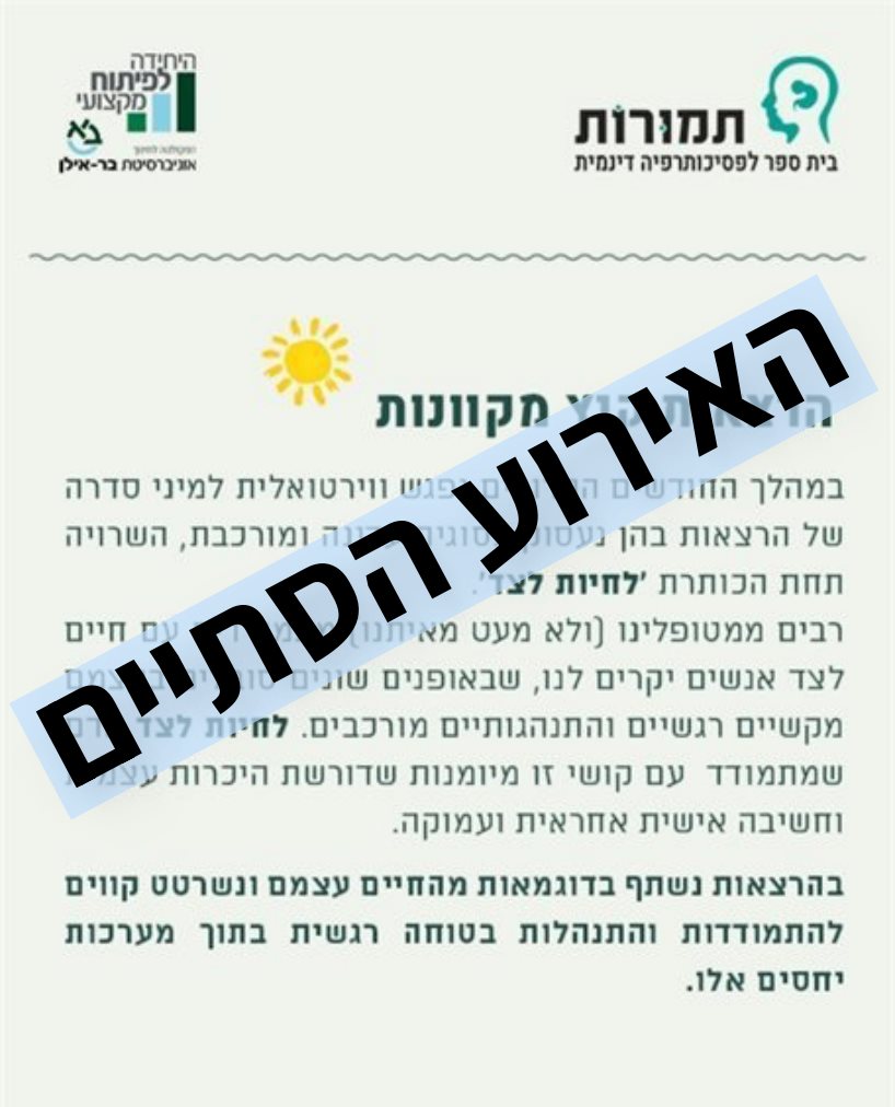 סדרת מפגשים מקוונים המציעה גישות, מודלים והתערבויות שהתגבשו בשדה הטיפולי במענה למגוון קשיים ומצוקות נפשיות, ומטרתה להנגיש לקהילה המקצועית ידע מקצועי שהתפתח סביב אתגרים טיפוליים ספציפיים.