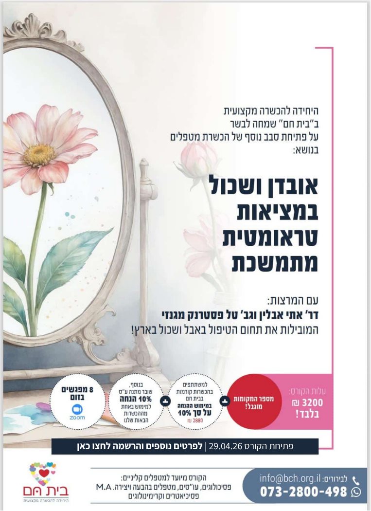 ערב זה יוקדש לעיסוק בשאלת ההתמקמות בעמדה הטיפולית במפגש עם יגון. נפתח דיון בחוויותיהם של מטפלים ובחרדה המתעוררת לעיתים במפגש עם תכנים אלה, לצד בחינה של מענים הדרכתיים וקליניים למצבים אלו.