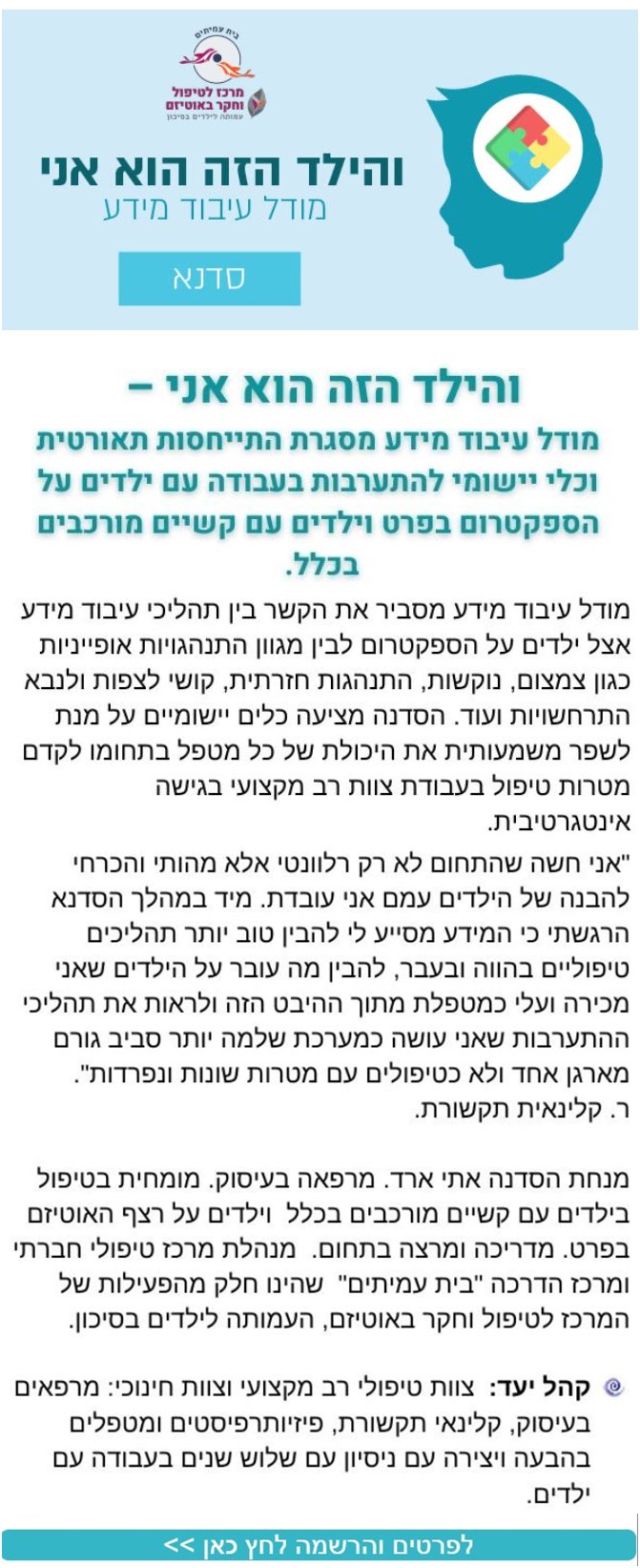 סדרת מפגשים מקוונים המציעה גישות, מודלים והתערבויות שהתגבשו בשדה הטיפולי במענה למגוון קשיים ומצוקות נפשיות, ומטרתה להנגיש לקהילה המקצועית ידע מקצועי שהתפתח סביב אתגרים טיפוליים ספציפיים.