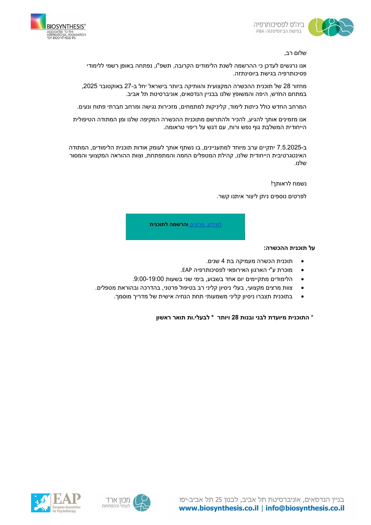 פסיכותרפיה בגישת ביוסינתזה - מחזור 28