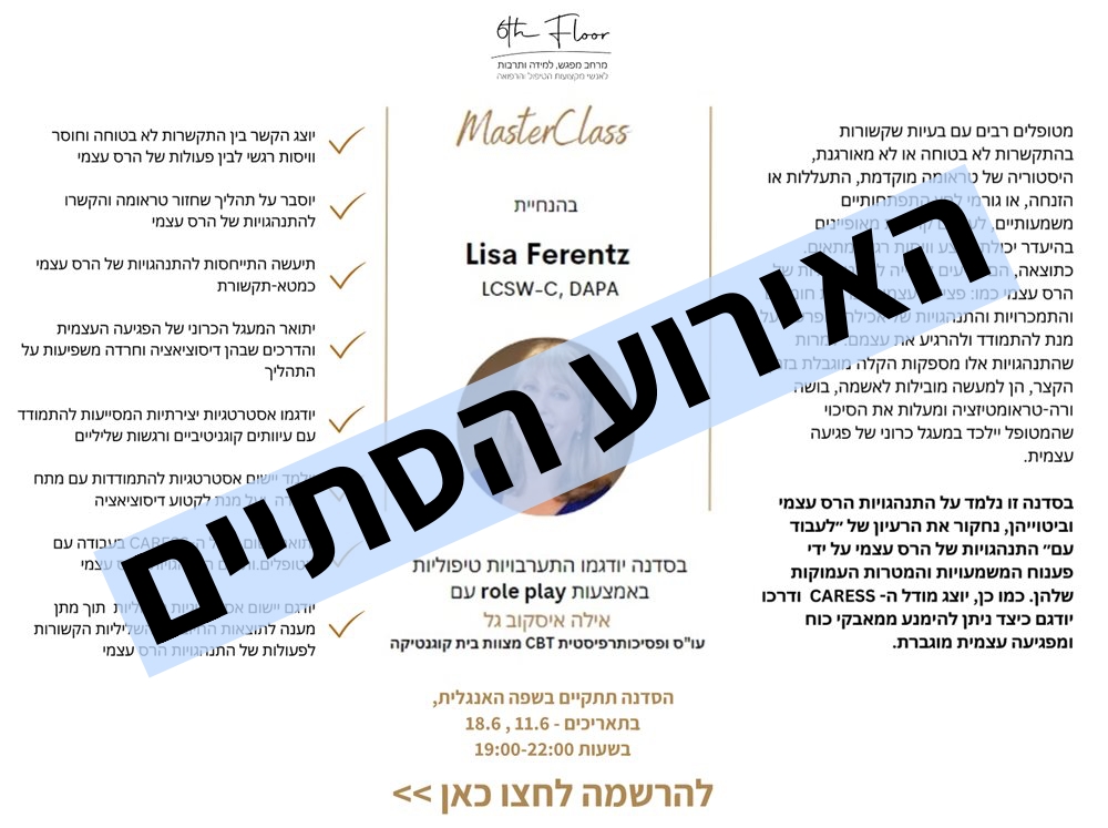 המציאות בישראל בשנים האחרונות מעצימה עוד יותר את הצורך במטפלים מיומנים, בעלי כלים מעשיים ותשתית תיאורטית יציבה. הקורס "מפת הדרכים לטיפול בטראומה" מבוסס על ניסיון קליני, מחקרי והדרכתי רחב היקף.