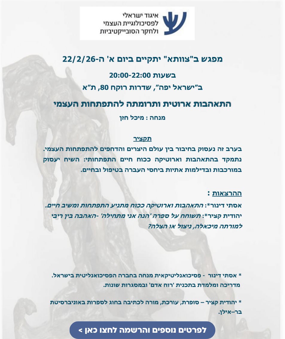 מפגש ב"צוותא": התאהבות ארוטית ותרומתה להתפתחות העצמי