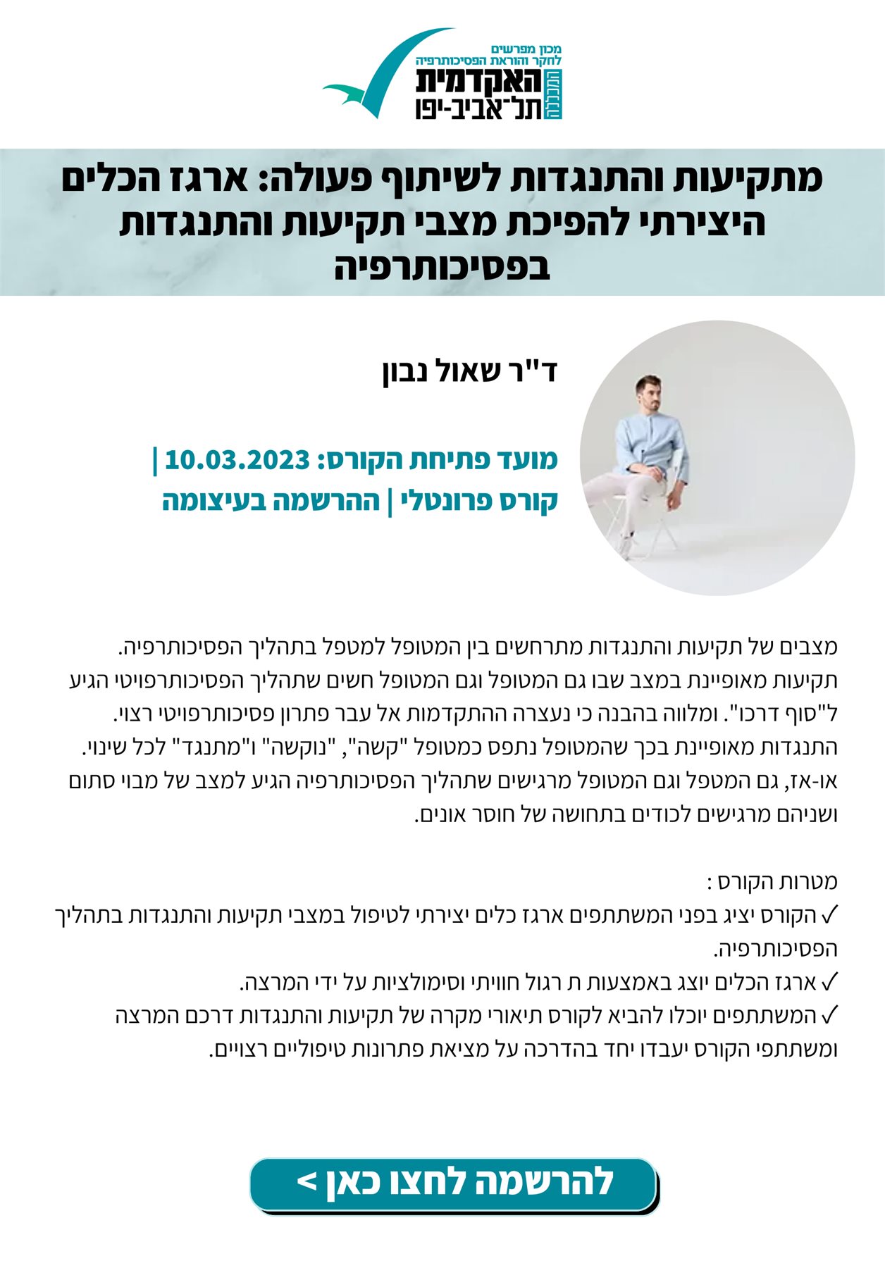סדרת מפגשים מקוונים המציעה גישות, מודלים והתערבויות שהתגבשו בשדה הטיפולי במענה למגוון קשיים ומצוקות נפשיות, ומטרתה להנגיש לקהילה המקצועית ידע מקצועי שהתפתח סביב אתגרים טיפוליים ספציפיים.