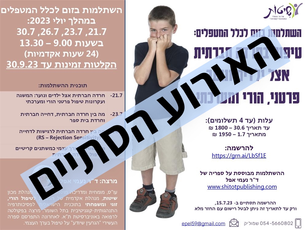 סדרת מפגשים מקוונים המציעה גישות, מודלים והתערבויות שהתגבשו בשדה הטיפולי במענה למגוון קשיים ומצוקות נפשיות, ומטרתה להנגיש לקהילה המקצועית ידע מקצועי שהתפתח סביב אתגרים טיפוליים ספציפיים.