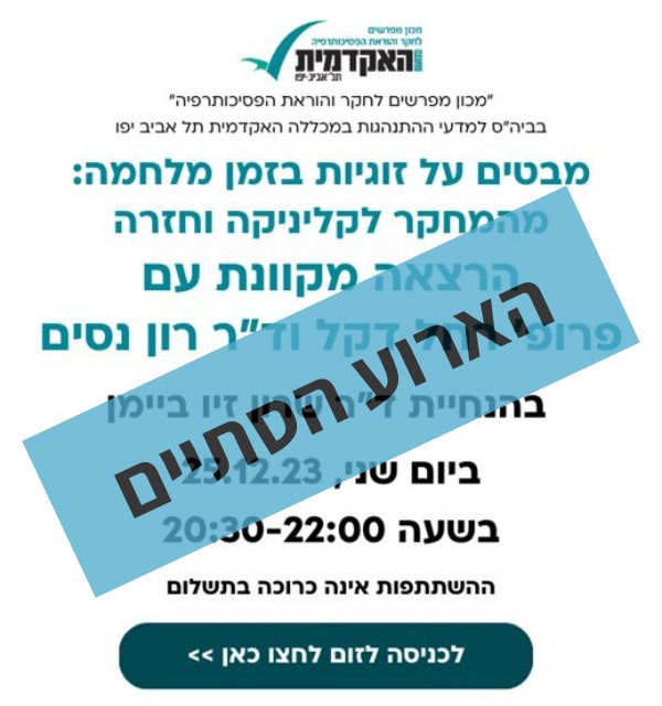 הכנס הפעם מוקדש לנו, קהילת המטפלות והמטפלים הזוגיים והמשפחתיים, שהתגייסו ומטפלים מאז היום שהפך את חיינו, בשבעה באוקטובר – בזוגות, משפחות וקהילות הנמצאות במעגלי פגיעה וטראומה רחבים ומתמשכים.