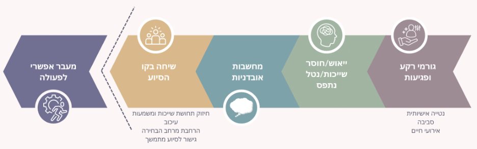 במקביל, השיח מאפשר שחזור תחושת שייכות ומשמעות. בהישען על תיאוריית האובדנות הבינאישית של Joiner (2005), הקו פועל לערער ברגישות את תחושת חוסר השייכות, את תחושת ה"נטל הנתפס", זאת באמצעות החיבור לקשר אנושי, אכפתי והכוונה לגורמי תמיכה בקהילה. בנוסף, השיח מעכב את המעבר ממחשבה לפעולה, בהתאם למודל המוטיבציוני‑ביצועי לאובדנות (IMV) של O’Connor (2018), באמצעות אתגור החשיבה האובדנית הצרה ("המצב לעולם לא ישתנה", "אף אחד בחיים לא יבין אותי" וכיוצא באלה), זיהוי משאבים פנימיים וחיצוניים והנגשת אסטרטגיות התמודדות יעילות (ראה תרשים 1).